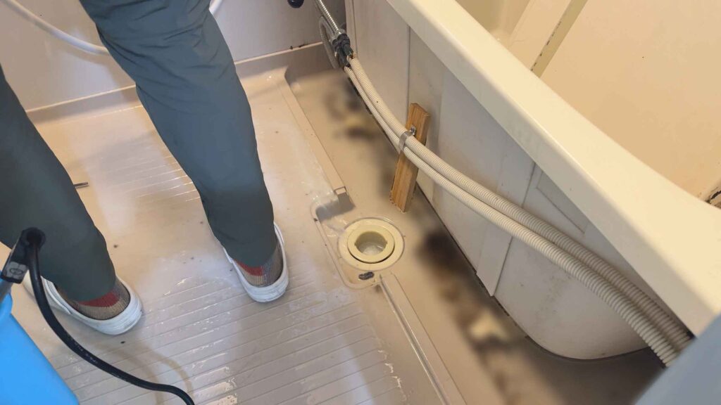 私が見ていましたら丁度浴槽のエプロン(バスタブのカバー)を外してお掃除していましたので写真を撮らさせていただきました(‘◇’)ゞ